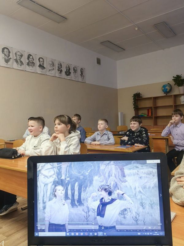 Младшие классы с волнением всматривались в печальные глаза «Алёнушки» В.М. Васнецова и богатырскую силу «Богатырей», рассуждая, о чём думают герои картин.