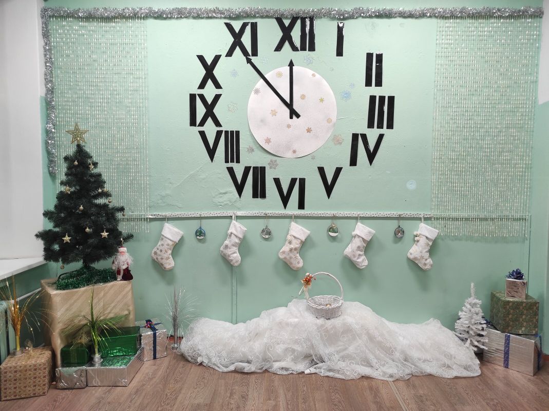 Центром притяжения стала праздничная фотозона в просторном фойе. Здесь выросла волшебная инсталляция: сверкающая арка с гирляндами, часы, стрелки которых близятся к полуночи и стилизованные снежные сугробы. Это место моментально стало самым популярным в школе — здесь каждый хочет сделать памятное фото с друзьями или классом, чтобы сохранить частичку этого предновогоднего настроения.